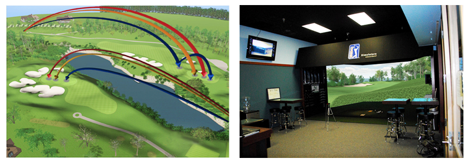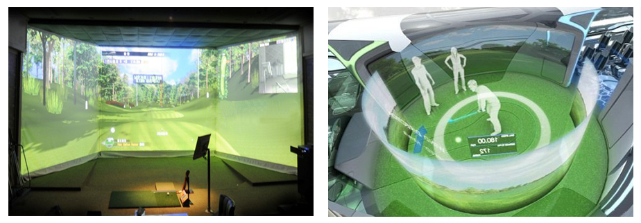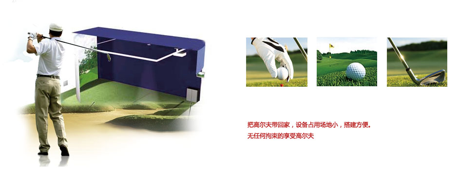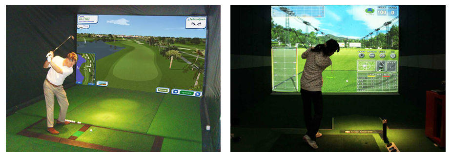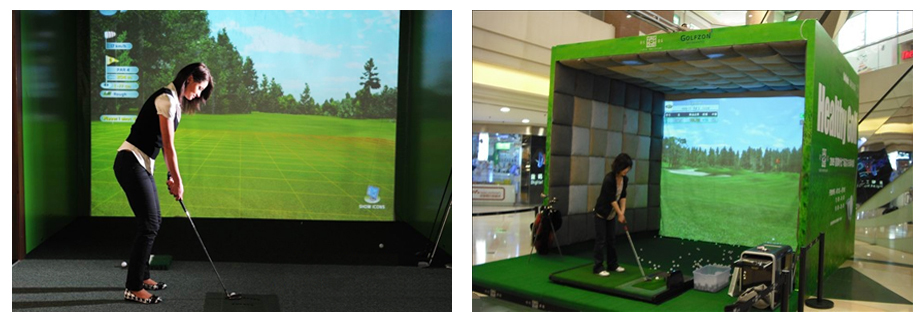 虚拟高尔夫系统采用完全真实的球杆和球,在30-40平米空间实现球手和球场互动;高尔夫球友们可以通过模拟器下场比赛;初学者可以通过系统软件进行挥杆分析;模拟高尔夫也是球手体验世界各地不同风格球场的好方法。虚拟高尔夫可以起到真是体验、教学练习和娱乐的目的。以其占地面积小,不受季节天气影响,投资少,逐渐成为都市高尔夫俱乐部、高档会所、高尔夫教学机构的焦点。