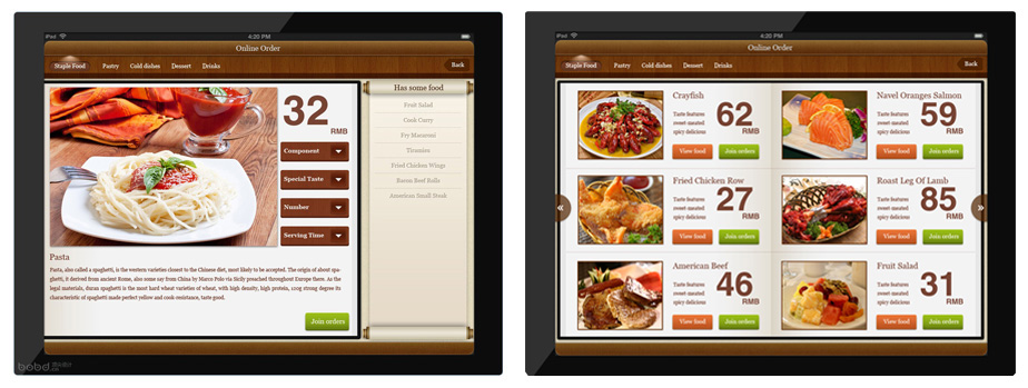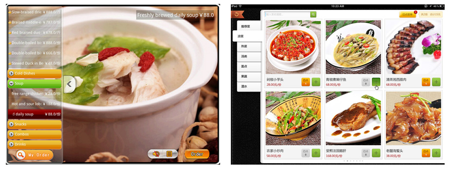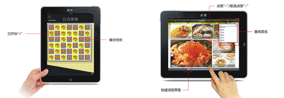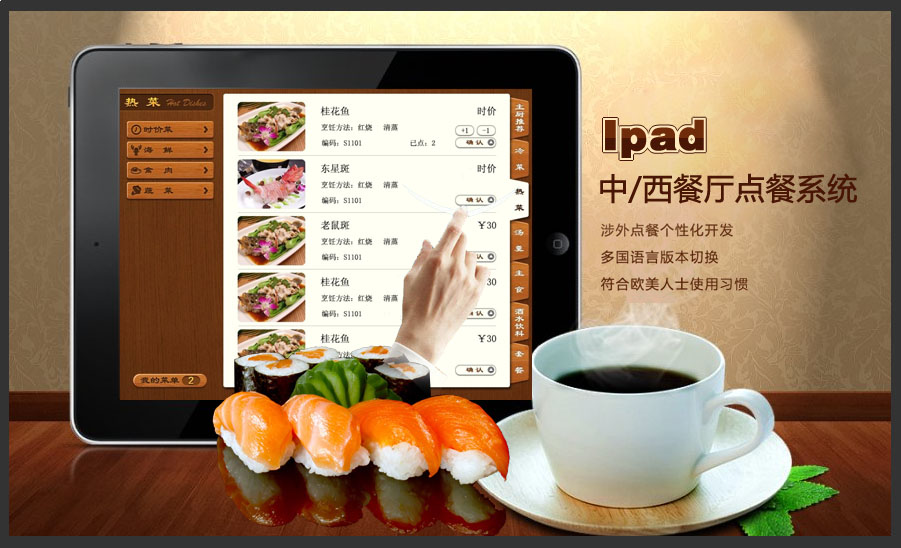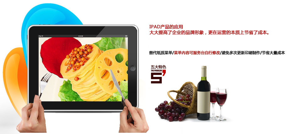 顾客可借助iPad精美的触摸屏“刷”屏点餐,整个点餐过程变得简单自由和方便快捷,提升用餐体验。 IPAD点餐系统通过Wi-Fi无线传输,集多种功能于一身。不仅能实现自助点餐、呼叫服务、一键下单、菜品随时更替,还可以植入酒店广告、进行宣传以及菜品推荐、营养分析等拓展功能,降低餐饮酒店运营成本。
