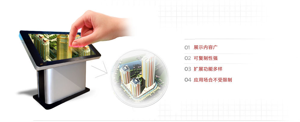用三维技术模拟项目全貌及项目周边环境,结合大屏幕显示系统、音响系统、中控系统,是融合了多媒体影像技术、交互体验技术等的新型数字沙盘。通过影片、灯光、音效及配音讲解,生动直观再现项目内容。它能使观众对展示对象有全面、立体、直观的整体理解,比传统沙盘更具震撼力和感染力。同时,对参观者来说是一种全新的体验,并能产生强烈的共鸣。主要应用于城市规划厅、科博馆、多媒体展厅、房地产展厅、多功能会议室、大型展会等人流量较大的展示场所。